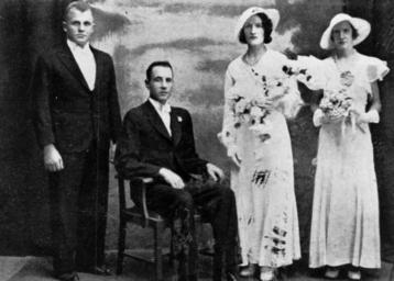 | Keywords: StateLibQld 2 109520 Edith Levett and Harry Riihimaa on their wedding day.jpg supplied with photograph The bride Edith Levett b 10 July 1907 and her bridesmaid wore large picture hats Harry and Edith had four daughters Aune Linne Davina Helen 1935 handle 10462/deriv/128957 Item is held by John Oxley Library State Library of Queensland PD-Australia StateLibQld-License Wedding ceremonies in Australia Flower bouquets in Australia Black and white photographs Bridesmaids of Australia Portraits of Queensland Headgear of Australia People of Mount Isa Brides of Australia 1935 in Queensland |