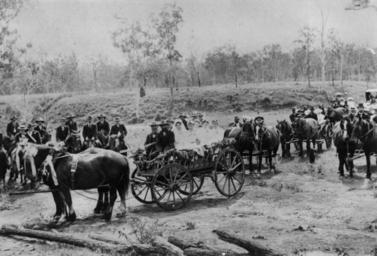 | Keywords: StateLibQld 2 128521 Wedding guests and bridal party at a German wedding, Ropeley, ca. 1905.jpg en Wedding guests and bridal party at a German wedding Ropeley ca 1905 The photograph appeared in The Queenslander with the headline A German Wedding in West Moreton The caption that accompanies the photograph reads The wedding party going to the church in decorated German waggons The bride was Miss Johanna Nauman daughter of Mrs M Nauman of Warwick and the bridegroom Mr Leopold Schultz son of Mr Charles Schultz a farmer of Ropeley near Gatton There were over 300 invited guests A salute of about thirty guns was fired on the night before the ceremony and a general celebration was maintained for a week afterwards according to German custom Information taken from The Queenslander 20 May 1905 The wedding party is assembled in a hay wagon and the horses are decorated with ribbons Some of the guests are on horseback while others are riding in wagons Everyone is dressed formally with hats ties and jackets circa 1905 handle 10462/deriv/78056 Item is held by John Oxley Library State Library of Queensland Contributor s Queenslander Brisbane Qld 1866-1939 PD-Australia StateLibQld-License Horse-drawn vehicles in Australia Wedding ceremonies in Australia Groups of people in Australia Black and white photographs Headgear of Australia Horses of Queensland Images from The Queenslander |