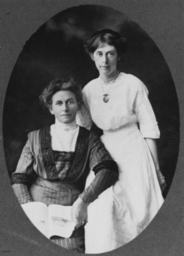 | Keywords: StateLibQld 2 139786 Two women posing for a portrait, 1910-1920.jpg en Two women posing for a portrait 1910-1920 Two women pose for a studio portrait wearing two different styles of dress The woman on the right is wearing a light coloured long skirt and blouse The blouse is made from broderie anglaise fabric Around her neck she wears two strings of pearls and on a chain a locket with a miniature portrait on the front The woman on the left wears a darker coloured dress made of striped fabric and trimmed with dark lace around the elbows and neckline She wears a light coloured blouse with a high collar under the dress Both women wear their hair piled loosely on their heads between 1910 1920 handle 10462/deriv/11759 Item is held by John Oxley Library State Library of Queensland PD-Australia StateLibQld-License Women's clothing of Australia Black and white photographs Dresses in Australia 1910 in Australia Lockets Two people people |