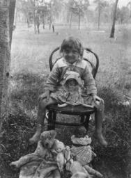 | Keywords: StateLibQld 2 145467 Girl on a chair outside with dolls.jpg en Girl on a chair outside with dolls Girl sitting astride a wooden chair on the grass with dolls and teddy bears She wears a dress and has bare feet and shares the seat with a doll The other toys lie on the ground in front of the chair A postcard supplied with the photograph headed' Betty' reads Dear Beat I don't know who is the culprit you or I but it is since I heard from though I think of you constantly This was taken in the yard is cetainly not flattering but is recognisable the 21st anniversary of your wedding day We are all well send much love Write a few lines soon 'Etta 1921-06-06 handle 10462/deriv/22201 Item is held by John Oxley Library State Library of Queensland PD-Australia StateLibQld-License Images of postcards from the State Library of Queensland Black and white photographs Portraits of Queensland Children of Queensland Dolls from Australia 1921 in Australia Teddy bears |