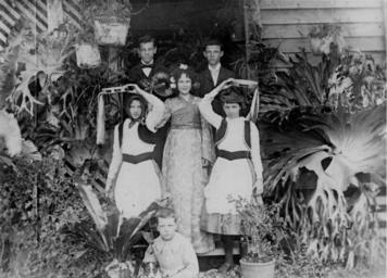 | Keywords: StateLibQld 2 163851 Six children pose in fancy dress in a doorway surrounded by staghorn ferns, 1890-1900.jpg en Six children pose in fancy dress in a doorway surrounded by staghorn ferns 1890-1900 Six children pose in fancy dress in a doorway surrounded by staghorn ferns Two boys at the back are in formal dress with jackets and ties A girl in the centre is in Japanese-style dress wearing a kimono and holding a fan She is flanked by two girls wearing headscarves vests dresses with belts and holding tambourines A boy sits on the ground in front of the group between 1890 1900 handle 10462/deriv/111839 Item is held by John Oxley Library State Library of Queensland PD-Australia StateLibQld-License Traditional clothes of Australia Groups of people in Australia Formal clothing in Australia Black and white photographs Portraits of Queensland Children of Queensland Flora of Queensland Flora of Australia Queensland in the 1890s People with tambourines |