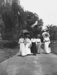 | Keywords: StateLibQld 2 173067 Group of women taking a stroll, 1900-1910.jpg en Group of women taking a stroll 1900-1910 Five women wearing similar outfits of long skirts belted at the waist long-sleeved lacy blouses and straw hats taking a stroll along a garden path Three of the women are holding umbrellas to protect them from the sun between 1900 1910 handle 10462/deriv/106511 Item is held by John Oxley Library State Library of Queensland PD-Australia StateLibQld-License Women's clothing of Australia Black and white photographs Headgear of Australia 1900 in Australia Umbrellas |