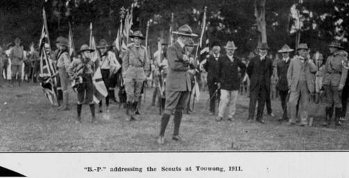 | Keywords: StateLibQld 2 198103 Lord Robert Baden-Powell, founder of the Scouting movement, addressing a group of Scouts at Toowong, Brisbane, 1911.jpg en Lord Robert Baden-Powell founder of the Scouting movement addressing a group of Scouts at Toowong Brisbane 1911 Caption 'B -P ' addressing the Scouts at Toowong 1911 1911 handle 10462/deriv/94632 Item is held by John Oxley Library State Library of Queensland PD-Australia StateLibQld-License Military uniforms of Australia Black and white photographs Children of Queensland Toowong Queensland 1911 in Australia Scouting in Australia Robert Baden-Powell |