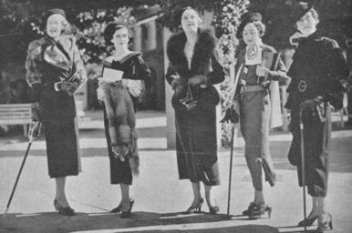 | Keywords: StateLibQld 2 206817 Mannequins modelling race day fashions at Ascot, Brisbane, 1935.jpg en Mannequins modelling race day fashions at Ascot Brisbane 1935 Group of women modelling fashions from Paul's millinery 111 Adelaide Street Brisbane Fashions include animal furs walking canes hats high heeled shoes scarves and gloves One of the women is holding a pair of binoculars Caption Another Paul's Shop Triumph Paul's lead the fashions on Stradbroke Day at Ascot Mannequins' display on the lawns at Ascot of fashions from Paul's distinguished collection at Brisbane Arcade Adelaide Street 1935-06-06 handle 10462/deriv/125815 The Queenslander 6 June 1935 Contributor s Queenslander PD-Australia StateLibQld-License People with gloves in Australia Women's clothing of Australia Black and white photographs Headgear of Australia Ascot Queensland 1935 in Queensland People with canes Furs Fashion in 1935 Women with hats Images from The Queenslander Fur fashion in 1935 |