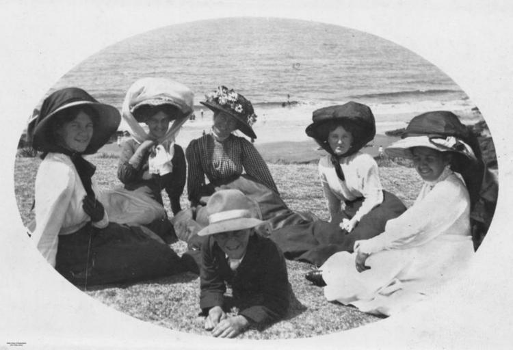 Keywords: StateLibQld 2 209165 Group of women and a boy on the sand at an unidentified beach, 1900-1910.jpg en Group of women and a boy on the sand at an unidentified beach 1900-1910 Group of women sitting on the sand at an unidentified beach in the early 1900s Their attire seems inappropriate for a day at the Queensland beach - the women are wearing long skirts filled out with layers of petticoats leather shoes and gloves They are all wearing large 'picture hats' tied under their chins with great swathes of fabric The boy in the centre is wearing a long sleeved jacket and hat between 1900 1910 handle 10462/deriv/129781 Item is held by John Oxley Library State Library of Queensland PD-Australia StateLibQld-License Women's clothing of Australia Black and white photographs Headgear of Australia Beaches of Queensland 1900 in Australia |