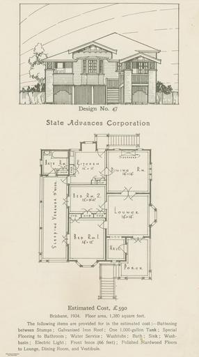 | Keywords: StateLibQld 2 228950 Drawing and floor plan of house design no. 47 from the State Advances Corporation, 1934.jpg en Drawing and floor plan of house design no 47 from the State Advances Corporation 1934 The drawing depicts the frontal aspect of the two bedroom plus sleepout house and is accompanied by a floor plan The text reads Design No 47 State Advances Corporation Estimated cost £590 Brisbane 1934 1 380 square feet The following items are provided for in the estimated cost battening between stumps galvanised iron roof one 1 000 gallon tank special flooring to bathroom water service washtubs bath sink washbasin electric light front fence 66 feet polished hardwood floors to lounge dining room and vestibule 1934 handle 10462/deriv/26853 Copied and digitised from an image appearing in Designs of dwellings Queensland State Advances Corporation Brisbane Govt Printer 1935 p 23 PD-Australia StateLibQld-License Public housing in Australia Black and white photographs Architecture of Queensland Houses in Brisbane 1934 in Brisbane |