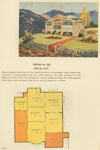 Keywords: StateLibQld 2 228974 Home Building Publishing Company home, Design No. 57, 1939.jpg en Home Building Publishing Company home Design No 57 1939 Floor plan and exterior drawing of Home Building Publishing Company home Design No 57 The spacious two bedroom home 1200 square feet includes a breakfast room The text reads Around about the price of this dwelling there are probably more homes being built in Queensland than any other design; the easy entrance to the bathroom from either the bedrooms or back landing makes the plan popular with most main entrance may be on side as shown or in front 1939 handle 10462/deriv/26871 Copied and digitised from an image appearing in 99 everyday homes for Queenslanders Brisbane Home Building Publishing Company 1939 p 67 PD-Australia StateLibQld-License Black and white photographs Architecture of Queensland Plans of houses in Queensland 1939 in Australia Images from The Queenslander |