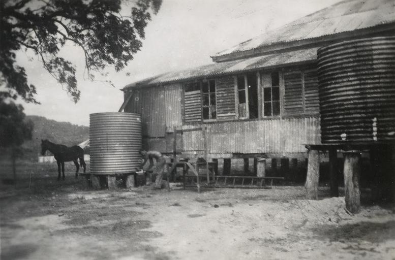 | Keywords: StateLibQld 2 250452 Water tanks for drinking and washing at the rear of a Cooktown house, 1942.jpg en Water tanks for drinking and washing at the rear of a Cooktown house 1942 Corrugated iron building assigned for enlisted men of the American Army's 7th Portable Surgical Hospital at Cooktown 1942 handle 10462/deriv/32837 Item is held by John Oxley Library State Library of Queensland PD-Australia StateLibQld-License Military buildings in Australia Military hospitals in Australia Black and white photographs Buildings in Cooktown Domestic rainwater tanks Queensland 1942 in Australia Australian Army |