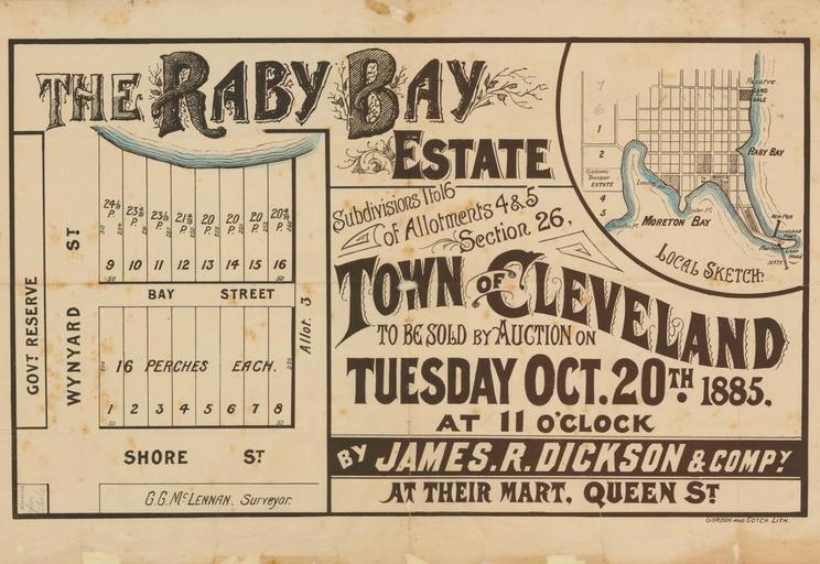 Keywords: StateLibQld 2 262824 Estate map of Raby Bay Estate, Raby Bay, Queensland, 1885.jpg en Estate map of Raby Bay Estate Raby Bay Queensland 1885 Real estate map showing allotments to be sold on the 20th October 1885 by James R Dickson Co auctioneer Plan includes inset with local sketch of the area The estate includes allotments on Shore Street Bay Street and Wynyard Street Raby Bay 1885 handle 10462/deriv/18414 Item is held by John Oxley Library State Library of Queensland PD-Australia StateLibQld-License Building blocks in Australia Black and white photographs Posters of Australia Redland City Queensland Historical maps of Queensland 19 1885 in Queensland Land auctions Plans Images from the State Library of Queensland Raby Bay |