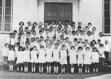 | Keywords: StateLibQld 2 388905 Students from St. Clare's Convent School, Tully, Queensland, ca. 1933.jpg en Students from St Clare's Convent School Tully Queensland ca 1933 This image is a group portrait of the students of St Clare's Convent School standing in rows on the steps outside the building The girls' dresses and shoes can be clearly seen The boys are all wearing white shirts most with ties between 1930 1933 handle 10462/deriv/193330 Item is held by John Oxley Library State Library of Queensland Chargois Studio PD-Australia StateLibQld-License Children's clothing of Australia School children of Queensland Black and white photographs Tully Queensland 1930 in Queensland Convent schools in Queensland |