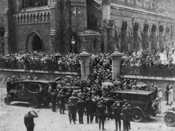 | Keywords: StateLibQld 2 390001 Funeral crowd outside St. Stephen's Cathedral, Brisbane, 1929.jpg en Funeral crowd outside St Stephen's Cathedral Brisbane 1929 A large crowd of mourners can be seen outside St Stephen's Cathedral The hearse is standing in the street outside the church and the coffin is being loaded into the back of it Another black motor vehicle is parked in the street behind the hearse Men in the crowd are wearing suits and the women are wearing smart clothes and hats 1929 handle 10462/deriv/193120 Item is held by John Oxley Library State Library of Queensland PD-Australia StateLibQld-License Black and white photographs Funerals in Brisbane Crowds in Australia 1929 in Brisbane Saint Stephen's Cathedral Brisbane |