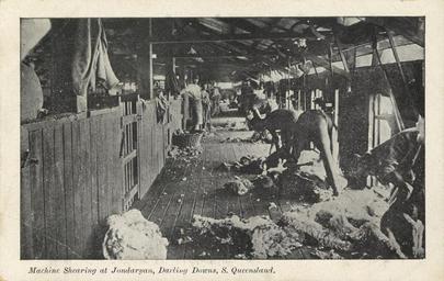 | Keywords: StateLibQld 2 67323 Machine shearing at Jondaryan on the Darling Downs, Southern Queensland.jpg en Machine shearing at Jondaryan on the Darling Downs Southern Queensland Part of the Intelligence and Tourist Bureau Brisbane postcard series handle 10462/deriv/2276 Copied and digitised from a postcard PD-Australia StateLibQld-License Images of postcards from the State Library of Queensland Wool production in Australia Black and white photographs Sheep shearing Shearers Jondaryan Woolshed Intelligence and Tourist Bureau Brisbane postcard series |