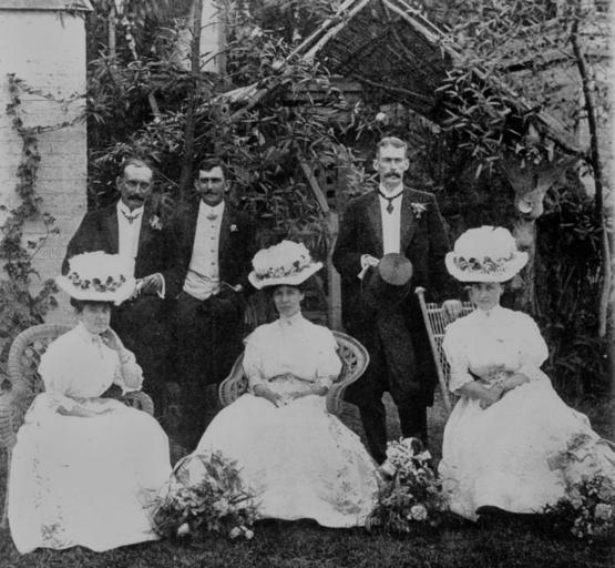 | Keywords: StateLibQld 2 69743 Attendants from the Persse - Parry-Okeden wedding in the gardens of Delamore, Kedron, Brisbane, 1907.jpg en Attendants from the Persse - Parry-Okeden wedding in the gardens of Delamore Kedron Brisbane 1907 The bridesmaids and groomsmen from the Persse - Parry-Okeden wedding in the gardens of Delamore at Kedron in October 1907 Bridesmaids were Miss Constance Parry-Okeden Miss Jessie Persse and Miss Leila Slade Groomsmen were Mr De Burgh D D Persse Best Man Captain F Newton and Mr L H C Morgan The wedding was between Miss Violet-Vivian Parry-Okeden and Mr Charles D Persse The ceremony took place at St Andrew's Church Lutwyche and the reception in the gardens of the grand residence Delamore The bridesmaids wore dresses trimmed with violet designs and carried baskets 'ornamented with heliotrope ribbons and bunches of violets' in honour of the bride's name Information taken from The Queenslander 12 October 1907 1907-10-01 handle 10462/deriv/84621 The Queenslander 12 October 1907 p 24 PD-Australia StateLibQld-License Wedding ceremonies in Australia Women's clothing of Australia Men's clothing of Australia Black and white photographs Bridesmaids of Australia Kedron Queensland 1907 in Australia |