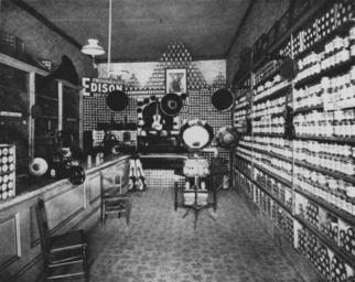 | Keywords: StateLibQld 2 70575 Interior of Heslop's Phonograph Depot, 1907.jpg en Interior of Heslop's Phonograph Depot 1907 This advertisement for the Brisbane shop Heslop's Phonograph Depot appeared in The Queenslander newspaper showing advertising signs for Edison phonographs and phonograph cannisters There are also various musical instrument a wooden counter and chairs for customers 1907 handle 10462/deriv/85602 The Queenslander 8 June 1907 Contributor s Queenslander Brisbane Qld 1866-1939 PD-Australia StateLibQld-License Building interiors in Queensland Black and white photographs Shops in Brisbane 1907 in Brisbane |