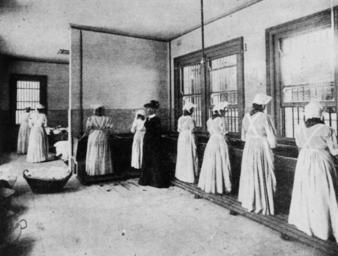 | Keywords: StateLibQld 2 75473 Prisoners using the laundry facilities at the new female division of Boggo Road Gaol, Brisbane, 1903.jpg en Prisoners using the laundry facilities at the new female division of Boggo Road Gaol Brisbane 1903 Interior view of prisoners working in the laundry at the new women's prison The inmates are washing in tubs lining the wall as others sort through linen in a separate area in the background Laundry baskets can be seen on the floor to the left A superviser standing in the middle of the photograph is overseeing the work 'In the laundry a big wash was in progress and judging by the whiteness of the linen seen in the ironing room there must be some good laundresses amongst the inmates The laundry is a beautifully cool and well ventilated room containing eight fixed tubs to which both pipe water and soft water are supplied by taps There are four large washing coppers set in brickwork and cement and these are provided with canopy-shaped ventilators There are seven large windows and two double doors The latter are of iron and the windows like all the others in the establishment are secured with massive iron bars' Information taken from The Queenslander 28 November 1903 pp 21 22 1903 handle 10462/deriv/88695 The Queenslander 28 November 1903 p 21 PD-Australia StateLibQld-License Military uniforms of Australia Black and white photographs Windows in Australia 1903 in Brisbane Laundries Boggo Road Gaol Female prisoners |