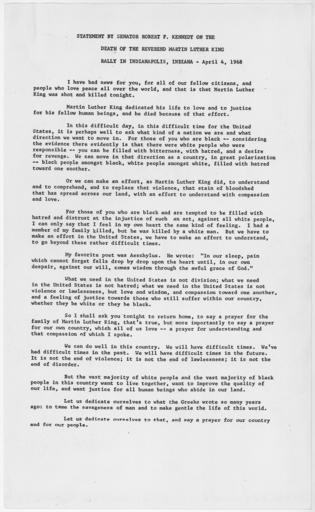 | Keywords: Statement by Senator Robert F. Kennedy on the Death of the Reverend Martin Luther King April 4, 1968 - NARA - 194037.jpg Scope and content Remarks by Senator Robert F Kennedy at a campaign rally in Indianaplis Indiana following the assassination of Martin Luther King Jr General notes 194037 Local identifier Kennedy Robert F Robert Francis 1925-1968 John F Kennedy Library NLJFK Columbia Point Boston MA 02125-3398 1968-04-04 Record group Collection JFK-RFK Robert F Kennedy Papers 1937 - 06/06/1968 Record group ARC 1169 Robert F Kennedy Papers Senate Papers Speeches and Press Releases compiled 1965 - 1968 Series ARC 194019 File unit Robert F Kennedy Papers Senate Papers Speeches and Press Releases 04/01/1968 - 04/04/1968 File unit ARC 194036 Variant control numbers NAIL Control Number NLK-RFK-SNFILESSPPR-040168TO040468-7FFFR Other versions <gallery> File Statement_by_Senator_Robert_F _Kennedy_on_the_Death_of_the_Reverend_Martin_Luther_King_April_4 _1968_-_NARA_-_194037 tif tif File Statement_by_Senator_Robert_F _Kennedy_on_the_Death_of_the_Reverend_Martin_Luther_King_April_4 _1968_-_NARA_-_194037 jpg jpg </gallery> NARA-cooperation PD-USGov Speeches by Robert F Kennedy Martin Luther King Jr 1968 texts 1968 in Indianapolis |
