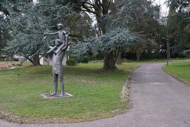 Keywords: statue child on the shoulders man family play figures park überlingen sculpture love parents steel grass away tree