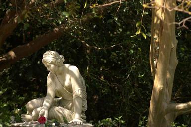 Keywords: statue garden tree red flower red flower nature sculpture park classic figure outdoor carved green woman sunny