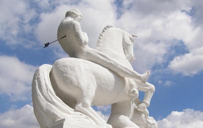 Keywords: statue man on horseback 1927 arrow in the back lech white piast dynasty grand-duke of poland birth-death 1186-1227 white horse statue tombstone cloudy blue sky white clouds jakub sculptor juszczyk poland pixabay bottom of screen