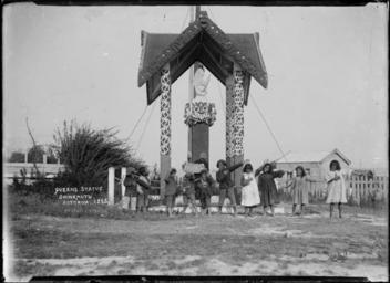 | Keywords: blackandwhite monochrome outdoor photo border black and white Shows a bust of Queen Victoria on a carved and decorated plinth protected by a carved and painted canopy, and surrounded by a chain fence. Several young boys and girls are standing in a row in front of the statue performing an action song, accompanied by a boy playing a piano accordion. A flagpole is just visible behind the statue. Photograph taken by William A Price in Jan 1908. Inscriptions: Inscribed - Photographer's title on negative -bottom left: Queens statue. Ohinemutu. Rotorua. 1255. Protd. W.A.P. 10.1.08 (very faint). William Archer Price lived and practised in Queen Street, Northcote, 1909-1910. Source: New Zealand Post Office directories Quantity: 1 b&w original negative(s). Physical Description: Dry plate glass negative 4.75 x 6.5 inches Statue of Queen Victoria at Ohinemutu. Price, William Archer, 1866-1948 :Collection of post card negatives. Ref: 1/2-001437-G. Alexander Turnbull Library, Wellington, New Zealand. natlib.govt.nz/records/23223322 Shows a bust of Queen Victoria on a carved and decorated plinth protected by a carved and painted canopy, and surrounded by a chain fence. Several young boys and girls are standing in a row in front of the statue performing an action song, accompanied by a boy playing a piano accordion. A flagpole is just visible behind the statue. Photograph taken by William A Price in Jan 1908. Inscriptions: Inscribed - Photographer's title on negative -bottom left: Queens statue. Ohinemutu. Rotorua. 1255. Protd. W.A.P. 10.1.08 (very faint). William Archer Price lived and practised in Queen Street, Northcote, 1909-1910. Source: New Zealand Post Office directories Quantity: 1 b&w original negative(s). Physical Description: Dry plate glass negative 4.75 x 6.5 inches Statue of Queen Victoria at Ohinemutu. Price, William Archer, 1866-1948 :Collection of post card negatives. Ref: 1/2-001437-G. Alexander Turnbull Library, Wellington, New Zealand. natlib.govt.nz/records/23223322 |