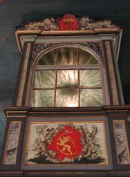Keywords: Stavern Kirke (stol).JPG Loge med Christian VII af Danmark og Norges monogram og Den Norske Løve Stavern Kirke Vestfold Norge own 2012-08 Orf3us Stavern kirke Royal monogram of Christian VII of Denmark Lion of Norway in heraldry