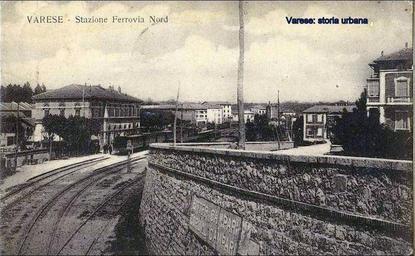 Keywords: La stazione delle Ferrovie Nord Milano (1885). Sul piazzale davanti alla stazione (odierna piazza Kennedy) si notano delle villette. varese