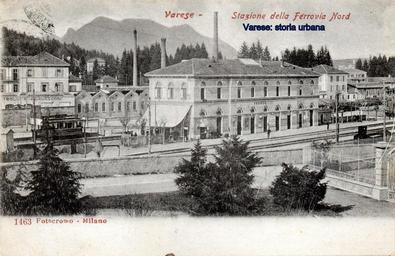 | Keywords: varese tram outdoor La stazione delle Ferrovie Nord Milano (1885) e il capolinea della tranvia per la Prima Cappella (1895) con un convoglio fermo. Sul piazzale con aiuole davanti alla stazione (odierna piazza Kennedy) si nota la recinzione di una villetta. Di fronte alla stazione lo stabilimento del Calzaturificio di Varese e le ciminiere dei Molini Marzoli Massari. La stazione delle Ferrovie Nord Milano (1885) e il capolinea della tranvia per la Prima Cappella (1895) con un convoglio fermo. Sul piazzale con aiuole davanti alla stazione (odierna piazza Kennedy) si nota la recinzione di una villetta. Di fronte alla stazione lo stabilimento del Calzaturificio di Varese e le ciminiere dei Molini Marzoli Massari. |