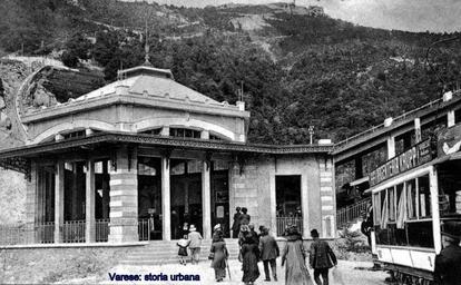 | Keywords: Immagine di passeggeri che entrano nella stazione della funicolare di Vellone. A destra la linea per Santa Maria del Monte (aperta nel 1909) a sinistra la linea per il Campo dei Fiori (inaugurata nel 1911). In primo piano il tram per Varese. varese funicolare tram |