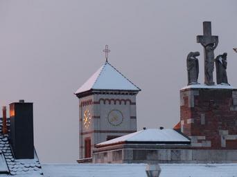 Keywords: steeple church winter snowy church of st john the baptist new ulm catholic garrison church parish church cross angel maria
