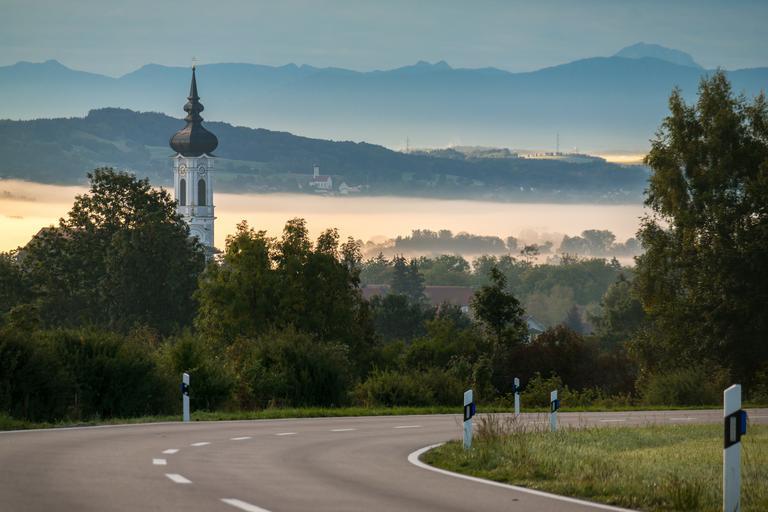 Keywords: steeple road fog fog bank alpine marie münster dießen diessen church germany ammersee curve bavaria