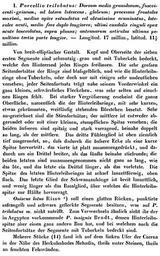 | Keywords: Stein1859 Porcellio trilobatus.png of the species Porcellio trilobatus now Trachelipus trilobatus by J P E Frdr Stein in the 1859 Berliner entomologische Zeitschrift volume 3 pages 260-267 http //www archive org/details/berlinerentomolo31859berl J P E Frdr Stein a k a Samuel Friedrich Nathaniel Stein Czech entomologist 1818-1885 1859 Corrected version of OCRed text 1 Porcellio trilobatus Dorsum medio granulosum fuscescenti-griseum ad latera lutescens glabrum; processus frontales maximi medius apice rotundatus vel obtusissime acuminatus laterales acuti medio fere duplo longiores; ultimi caudalis cinguli apex acute lanceolatus supra planus; antennarum articulus ultimus penultimo tertia parte longior -- Longitud 17 millim latitud 11 5 millim Von breit-elliptischer Gestalt Kopf und Oberseite der sieben ersten Segmente sind schmutzig - grau und mit Tuberkeln bedeckt welche den Hinterrand jedes Ringes freilassen Die sehr groĂen SeitenfortsĂ€tze der Ringe sind blaĂgelblich und wie die Hinterleibsringe ohne Tuberkeln oder doch nur mit einigen sehr undeutlichen versehen; jeder Seitenfortsatz trĂ€gt nahe seinem Vorderwinkel ein ganz kleines schwĂ€rzliches Fleckchen was sehr selten auf einzelnen Ringen fehlt Bei starker VergröĂerung erscheint die ganze OberflĂ€che namentlich die der Hinterleibsringe mit sehr kurzen etwas gekrĂŒmmten weitlĂ€ufig stehenden BĂŒrstchen besetzt Sehr ausgezeichnet sind die StirnfortsĂ€tze; der mittlere ist entweder abgerundet oder mit einer kleinen slumpflichen Spitze versehen; die beiden Ă€uĂeren sind spitzig und stark vorragend beinahe doppelt so lang als der mittlere Das dritte FĂŒhlerglied ist oben ziemlich tief ausgerandet so daĂ dadurch die Ă€uĂere Ecke als eine kurze Spitze hervortritt das vierte ist platt zusammengedrĂŒckt und dadurch um ein Drittel breiter als das fĂŒnfte beinahe stielrunde; die beiden letzten sind zusammengenommen nicht ganz so lang wie das 5te und das letzte ein Drittel lĂ€nger als das vorletzte Die Spitze des letzten Hinterleibsringes ist scharf lanzettförmig oben flach Das letzte Glied der SchwanzanhĂ€nge ist breit lanzettlich und wenig lĂ€nger als das Basalglied ĂŒber welches die Hinterleibsspitze zur HĂ€lfte hervorragt Oniscus latus Risso Risso histoire naturelle de l'Europe meridion Tom V p 116 1826 soll einen glatten RĂŒcken punktirte safrangelb und schwarz gefleckte Segmente besitzen was auf P trilobaltis m nicht zutrifft Zum Verwechseln Ă€hnlich sieht ihr der in Aegypten vorkommende P insignis Brndt dessen Hinterleibsspitze aber einen ganz andern Bau hat und bei welchem auch die SeitenfortsĂ€tze der Segmente mit Tuberkeln bedeckt sind Mehrere StĂŒcke 14 fand ich auf dem linken Ufer der Czerna in der NĂ€he des Herkulesbades Mehadia theils unter Steinen theils an feuchten FelswĂ€nden PD-old Trachelipus trilobatus P4b3rd Mehadia |