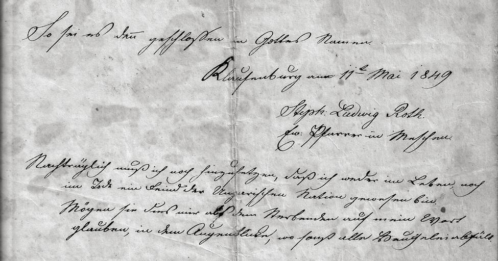 | Keywords: Stephan Ludwig Roth Abschiedsbrief Ausschnitt z.jpg  Transkription So sei es denn geschlossen in Gottes Namen Klausenburg am 11 Mai 1849<br/>Stephan Ludwig Roth <br/>Ev Pfarrer in Meschen Nachträglich muß ich noch dazusetzen daß ich weder im Leben noch im Tode ein Feind der ungarischen Nation gewesen bin Mögen sie dies mir als dem Sterbenden auf mein Wort glauben in dem Augenblick wo sonst alle Heuchelei abfällt Ausschnitt aus einer alten Abschrift von Stepahn Ludwig Roths Abschiedsbrief an seine Kinder Alte Abschrift de wikipedia by DietG Transfered by Hkoala Text Stephan Ludwig Roth; Abschrift unbekannt 1849 PD-old-100 Original upload log Upload date User Bytes Dimensions Comment 2010-04-29 21 56 30 de User DietG DietG 988986 1280×672 <small><nowiki> Information Ausschnitt aus eine alten Abschrift von Stepahn Ludwig Roths Abschiedsbrief an seine Kinder Alte Abschrift unbekannt Andere Versionen Klausenburg am 11 Ma</nowiki></small> Manuscript letters written messages Stephan Ludwig Roth |