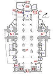 | Keywords: StephansdomAnnotated.png Floor plan of St Stephans' Cathedral in Vienna with significant features marked 2005-12-26 own assumed StanZegel Legend CT Christ with a Toothache sculpture; Fr3 Tomb of Emperor Frederick III; G Giant Door HA High Altar; MP Maria Pötsch icon; NT North Tower; P Pulpit; PES Prince Eugene of Savoy burial chapel; RT Roman Towers; S Sundial; SJC San Jphn Capistrano pulpit; ST South Tower; WNA Wiener Neustädt Altar; derivative works StephansdomAnnotated-es png Plans of St Stephen's Cathedral Vienna |