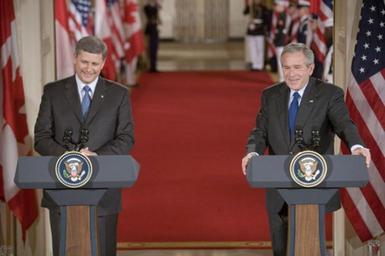 | Keywords: Stephen Harper and George W. Bush July 6 2006.jpg President George W Bush and Canadian Prime Minister Stephen Harper hold a joint press conference in the East Room Thursday July 6 2006 The President and I have agreed provide a more forward-looking approach focused on the environment climate change air quality and energy issues in which our governments can cooperate said Prime Minister Harper We raised the issue of how regulatory cooperation could increase productivity while helping to protect our health safety and environment http //www whitehouse gov/news/releases/2006/07/images/20060706_p070606kh-0383-515h html page http //www whitehouse gov/news/releases/2006/07/images/20060706_p070606kh-0383-515h jpg image 2006-07-06 White House photo by Kimberlee Hewitt public domain PD-USGov Stephen Harper in 2006 George W Bush with national leaders George W Bush in 2006 20060706 George W Bush at a lectern 6 July July 2006 in the United States Relations of Canada and the United States Stephen Harper with national leaders |