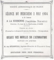 | Keywords: Sternfeld Lecture Sorbonne Invitation 1934.jpg en The invitation to the lecture delivered by A Sternfeld Some new approaches to the astronautics Sorbonne May 4 1934 ru П игласительный билет на лекцию есколько новых взглядов на аст онавтику п очитанную А и Ште нфельдом в Со бонне 2 мая 1934 г мой домашний а хив Э Бе ман-Ште нфельд Опубликована в книге А Ште нфельда Введение в космонавтику 1974 Cc-zero Ary Sternfeld | ||||