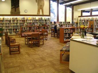| Keywords: Stevenson Washington public library interior.jpg Interior of the Stevenson Public Library in Stevenson Washington Shows a number of bookshelves containing many books several round wooden tables surrounded by wooden chairs two young women working on public computer terminals a desk with yellow flowers and a phone on it to the right two pieces of art made of fabric and cardboard a horse near the clock in the upper-left and a large window in the upper-right Own 2007-10-17 14 00 42 Dcoetzee 45 695402 -121 881616 Reading rooms Interiors of libraries in Washington state Stevenson Washington |