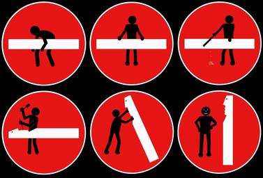 Keywords: stick figure pictures history road sign traffic sign action isolated traffic street sign funny one way street ban bar red
