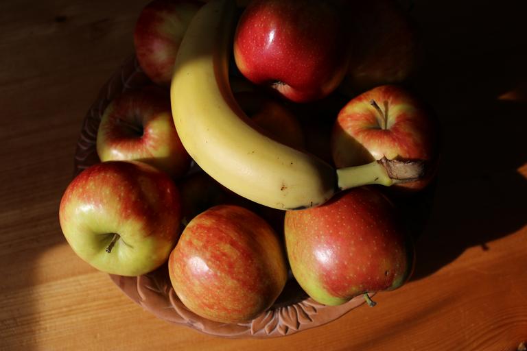 Keywords: still life apple fruit fruit bowl fruits banana vegetarian light shadow delicious vitaminhaltig kernobstgewaechs nature food nutrition vitamins vegan garden eat red frisch sweet healthy remove close bio gut