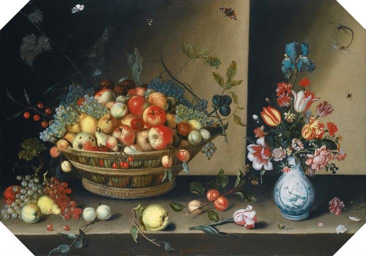 Keywords: Still Life of Apples, Pears, Peaches and Plums with Grapes and Walnuts by Johannes Baers.jpg en Still Life of Apples Pears Peaches and Plums with Grapes and Walnuts in a Wicker Basket Together with Flowers Including Tulips Irises and Carnations in a Blue and White Vase upon a Table Top by Johannes Baers oil on canvas 104 by 146 7 cm Sotheby's Creator Johannes Baers Johannes Baers PD-old-100 |
