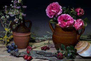 Keywords: still life flowers roses vase deco mussels bouquet wood berries wild flower