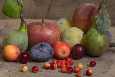 Keywords: still life fruit apple frisch pears plums berries walnut wood