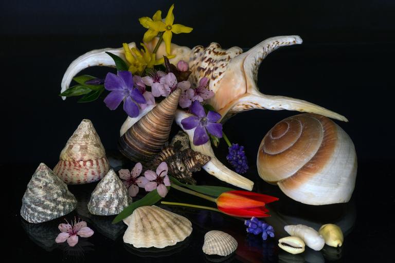 Keywords: still life mussels flowers tulips