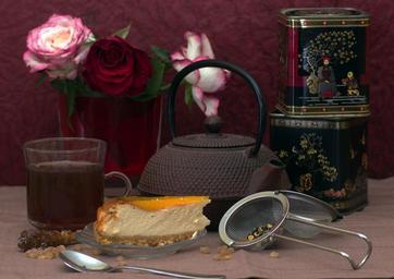 Keywords: still life tee pot teapot tea tins cake roses