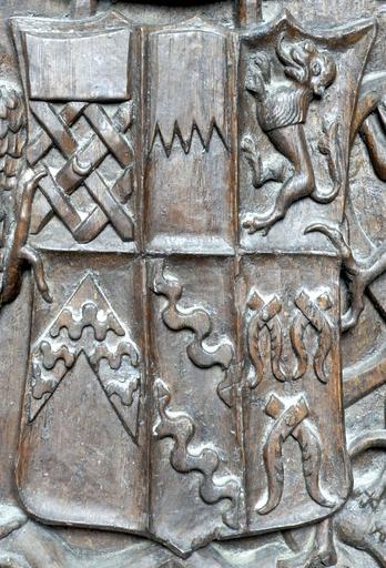Keywords: StLeger Escutcheon Monkleigh Devon.png FitzWarin feudal baron of Bampton Quarterly per fess indented argent and gules<ref>Pole p 482</ref> 3rd A lion rampant crowned possibly Turberville 4th Hankford of Annery for Richard II Hankford c 1397-1431 of Annery feudal baron of Bampton Sable a chevron barry undee argent and gules<ref>Pole p 486</ref> 5th Stapledon for Stapledon of Annery Argent two bends undee sable<ref>Pole p 502</ref> as visible on monument of Walter Stapledon Bishop of Exeter in Exeter Cathedral 6th Argent three barnacles gules tied sable Donet of Sileham Rainham Kent<ref>As seen on the Garter stall plate of Sir Anthony St Leger d 1559 KG Sir John St Leger d 1442 of Ulcombe Kent married Margery Donet or Donnet daughter and heiress of James Donet d 1409 of Sileham Rainham Kenthttp //www british-history ac uk/report aspx compid 62942</ref> own photo Lobsterthermidor <span class signature-talk ></span> 22 48 15 August 2014 UTC century 16 Monkleigh church St Leger arms FitzWarin arms Hankford arms Stapledon arms Donet arms |