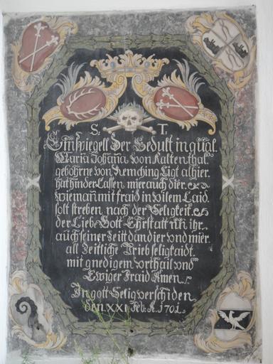 Keywords: StMichael-Apfeltrang10.jpg Pfarrkirche St Michael in Apfeltrang Gemeinde Ruderatshofen; Scagliola-Epitaph für Johanna von Kaltental geb von Rechmingen 1701 ; mit Wappen Kaltental und Remchingen sowie in den Ecken Ahnenwappen Remchingen Gaisberg Berndorf Syrgenstein own 2012-04-21 12 58 45 Ordercrazy St Michael Apfeltrang Wall mounted church monuments in Swabia administrative region Scagliola 1701 works in Bavaria Mosaics of coats of arms Coats of arms of Kaltental family Coats of arms of Remchingen family Coats of arms of Gaisberg family Coats of arms of Berndorf family Coats of arms of Sirg von Sirgenstein family |