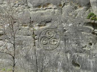 | Keywords: stone rock steinzeichnung relief characters ornament pattern triskelion importance triskel symbol image radialsymmetrisch arcs open spiral spirals new stone age celts celtic mythology mythology mystical sand stone petroglyph felsbild engraving scraped picked rock single incision |