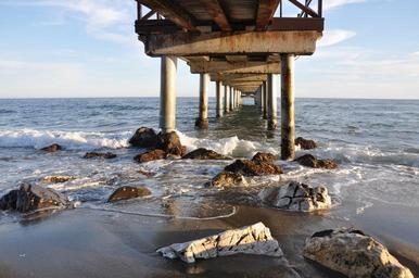 Keywords: stones sea beach rocks breakwater wooden bridge