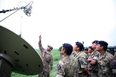 | Keywords: people Pfc. Jordan Johnson of the 44th Expeditionary Signal Battalion, 2nd Signal Brigade, explains the function and capabilities of a Secure Internet Protocol Router/Non-secure Internet Protocol Router (SIPR/NIPR) Access Point satellite terminal, or SNAP system, to Soldiers from the British Army's 250th Gurkha Signal Squadron, 30th Signal Regiment, at a cross training event, June 1, 2016 during exercise Stoney Run in Bramcote, England. Stoney Run is an annual U.S.-U.K. signal exercise designed to test and validate communications and network capabilities, and enhance interoperability and partner capacity between the two NATO Allies. Photo Credit: Mr. William B. King, 5th Signal Command (Theater) Pfc. Jordan Johnson of the 44th Expeditionary Signal Battalion, 2nd Signal Brigade, explains the function and capabilities of a Secure Internet Protocol Router/Non-secure Internet Protocol Router (SIPR/NIPR) Access Point satellite terminal, or SNAP system, to Soldiers from the British Army's 250th Gurkha Signal Squadron, 30th Signal Regiment, at a cross training event, June 1, 2016 during exercise Stoney Run in Bramcote, England. Stoney Run is an annual U.S.-U.K. signal exercise designed to test and validate communications and network capabilities, and enhance interoperability and partner capacity between the two NATO Allies. Photo Credit: Mr. William B. King, 5th Signal Command (Theater) |