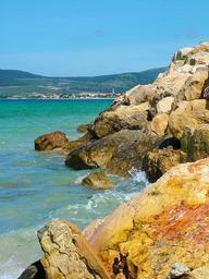 Keywords: stony beach water sea seaside far away village italy