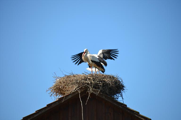 Keywords: storchennest nest storks birds animals rattle stork nature white storks sky stork village blue summer roof idyllic